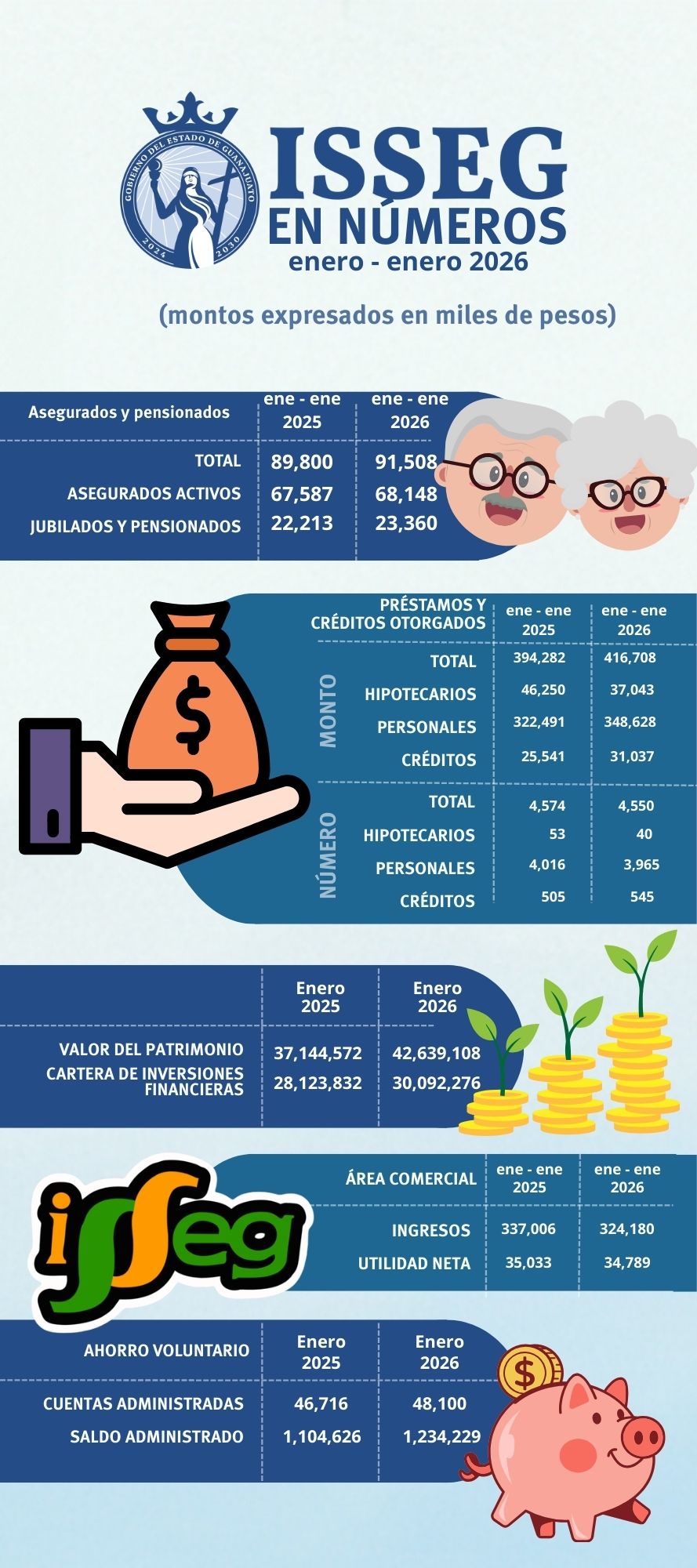 1. Patrimonio: Conjunto de bienes, derechos y obligaciones del Instituto. Se determina como la diferencia entre activos y pasivos con los que cuenta el ISSEG. Entre los principales activos se encuentran la cartera de inversiones financieras y el saldo en préstamos; entre los principales pasivos se encuentran las cuentas por pagar a proveedores del área comercial y el saldo del ahorro voluntario.